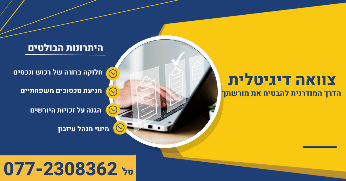 | מהי צוואה דיגיטלית | הרחבה של הצוואה המסורתית, הכוללת הוראות לנכסים דיגיטליים ומסרים רוחניים כמו סיפורים, זיכרונות, מסרים אישיים והקלטות וידאו. | 1. שמירה על זיכרונות<br>2. מניעת סכסוכים<br>3. זמינות ונגישות<br>4. היבט רגשי |